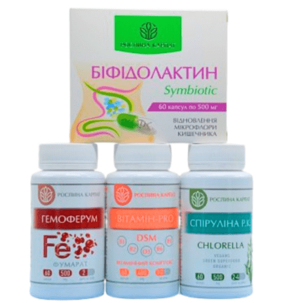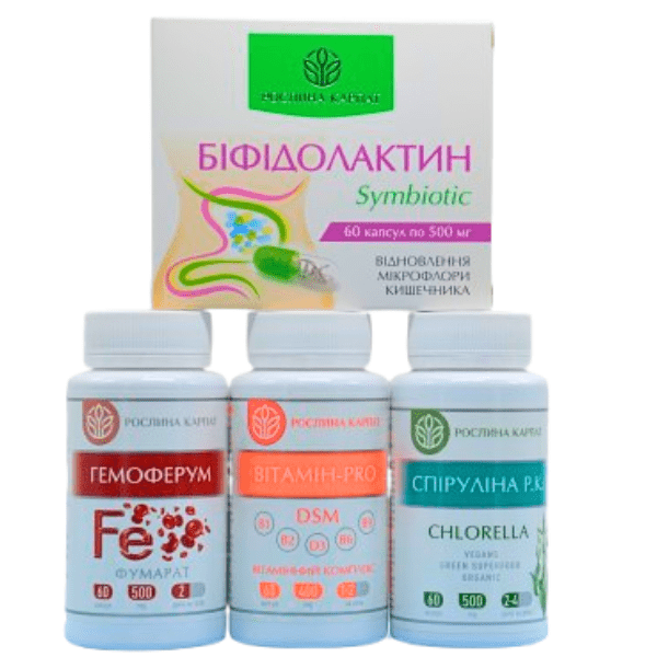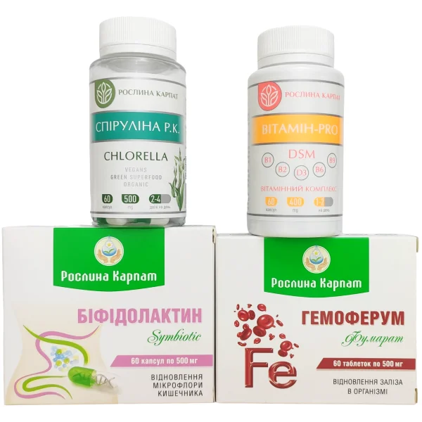 Перший курс програми Рослина Карпат розроблений для комплексної підтримки організму при зниженому рівні гемоглобіну. До складу входить Гемоферум — джерело заліза, яке сприяє нормалізації процесів кровотворення та підвищенню рівня гемоглобіну. Біфідолактин symbiotic підтримує здорову мікрофлору кишечнику, що важливо для кращого засвоєння заліза та вітамінів.
