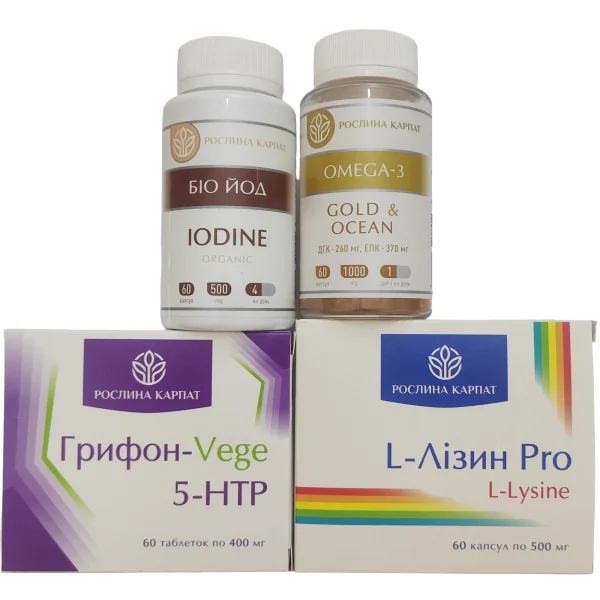 Омега 3 Gold Iceland — 1 упаковка, Грифон-Vege 5-HTP — 1 упаковка, L-Лізин Pro — 2 упаковки, Біо-йод organic — 3 упаковки.