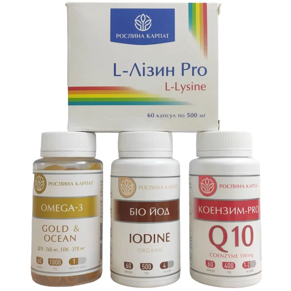 Біо-йод organic — 3 упаковки, Омега 3 Gold Iceland — 1 упаковка, L-лізин Pro — 2 упаковки, Коензим Q10 Pro — 1 упаковка.