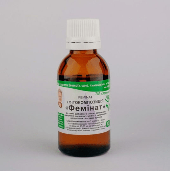 Фемінат є фітокомпозицією, що містить водно-спиртові екстракти лікарських рослин, які традиційно використовуються у фітотерапії для підтримки здоров’я жіночих статевих органів. Засіб спрямований на зменшення запальних процесів у матці, яєчниках, маткових трубах і піхві, а також на підтримку нормального функціонування лімфатичної системи в ділянці малого таза.
