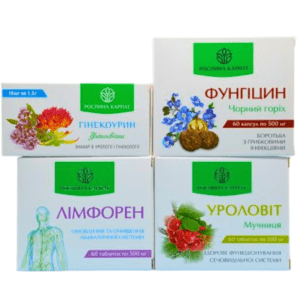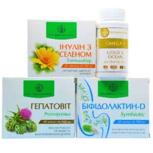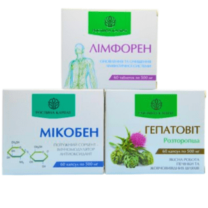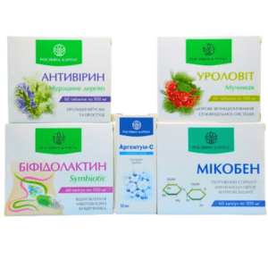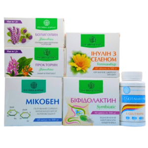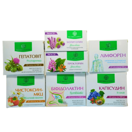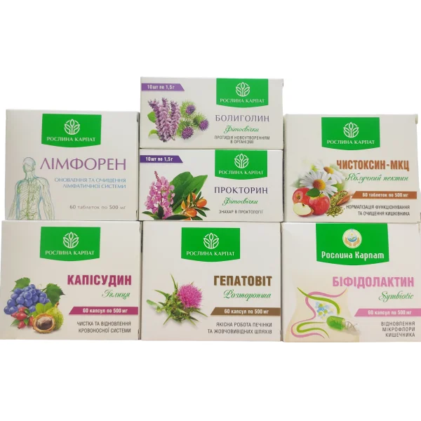 Прокторин — 1 упаковка, Болиголин — 1 упаковка, Гепатовіт — 1 упаковка, Біфідолактин symbiotic — 1 упаковка, Чистокцин МКЦ — 2 упаковки, Лімфорен — 1 упаковка, Капісудин — 1 упаковка.