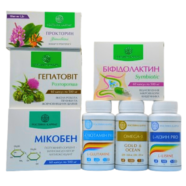До складу програми входять засоби, які діють комплексно. Гепатовіт підтримує функції печінки та процеси детоксикації, що важливо при тривалих запальних станах. Мікобен сприяє зменшенню запальних процесів і підтримує природний імунний баланс. Біфідолактин symbiotic допомагає відновлювати нормальну кишкову мікрофлору, що особливо важливо після загострень або порушень травлення.