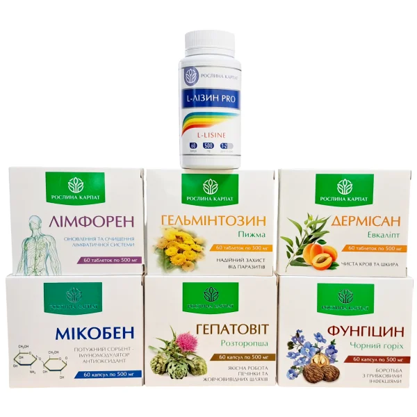 Програма очищення — це системний фітокомплекс, розроблений для покрокового очищення організму від грибкових токсинів, паразитів, продуктів розпаду, токсичних метаболітів, шлаків та надлишкових речовин, які накопичуються в тканинах та лімфатичній системі. Вона поєднує сім препаратів фірми «Рослина Карпат»: Мікобен, Лімфорен, Фунгіцин, Гельмінтозин, Дермісан, Гепатовіт та Л-лізин Про. Кожен із них має окремий напрям дії, але разом вони утворюють цілісну програму глибокого детокс-очищення.