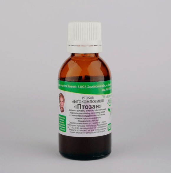Птозан є фітокомпозицією на основі водно-спиртових екстрактів лікарських рослин, які традиційно застосовуються у фітотерапії для підтримки тонусу м’язів і зв’язок органів малого таза. Засіб спрямований на зміцнення м’язово-сполучного апарату, що підтримує матку, піхву та інші органи сечостатевої системи.