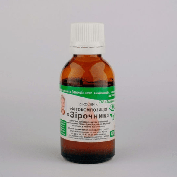 Зірочник — це фітокомпозиція на основі водно-спиртових екстрактів лікарських рослин, які традиційно застосовуються у фітотерапії для підтримки функціонування органів зору. Засіб спрямований на підтримку нормального стану кришталика ока, зменшення запальних процесів та покращення обмінних процесів у тканинах очного апарату.